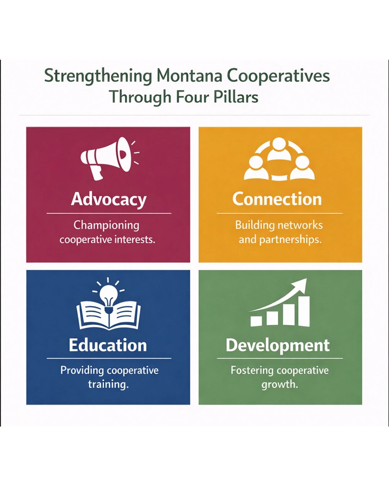 Welcome to the Montana Council of Cooperatives, where we unite, promote, and strengthen Montana's cooperative community. Our commitment is guided by four core pillars: Co-op Advocacy, Connection, Education, and Development.